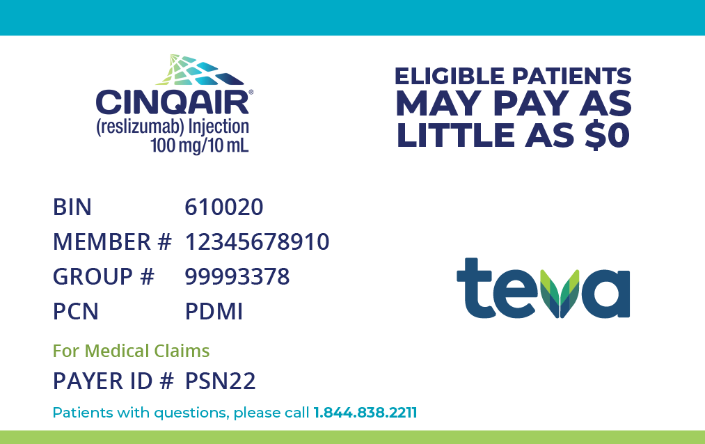 Patients use the CINQAIR® Cost Support Program Card to pay out-of-pocket costs for treatment with CINQAIR®.